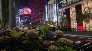 雨の銀座に紫陽花が咲いていました。人もクルマも少ない日が続いています。もう少し遅くなると街の灯も暗くなるようです。タクシーの行列もなかなか進みません。まわりのネオンも寂しそうな感じです。